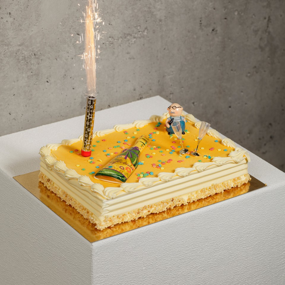 Hoch soll er leben! Mit dieser Torte wird Opa gebührend gefeiert – es knallen Korken und ein Feuerwerk.
